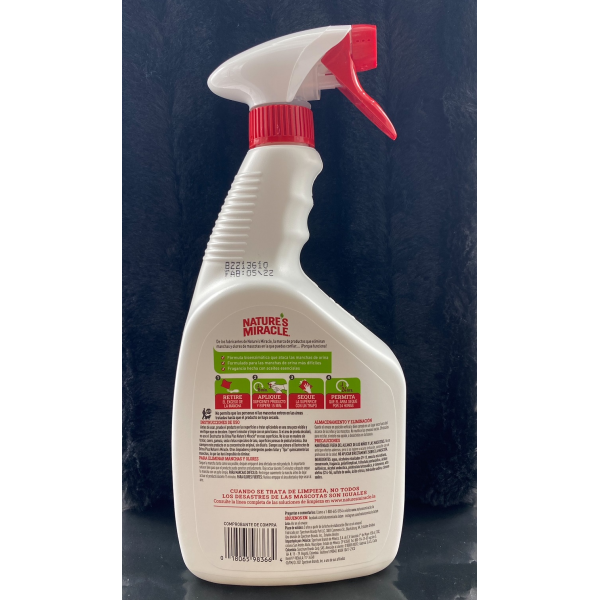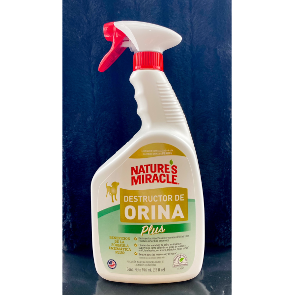 Instrucciones de Uso: Antes de usar, pruebe el producto en las superficies a tratar aplicandolo en una zona poco visible y verifique que no se decolore. Espere 5 minutos y limpie con un paño blanco. Si el area de prueba decoloró, no use el Destructor de Orina Plus Natures Miracle en esas superficies. No lo use en madera sin tratar, cuero, gamuza, seda o telas especiales de lana, superficies porosas de piedra/ceramica. Use siempre este producto en su concentracion original, sin diluirlo. Siempre use primero el Destructor de Orina Plus Natures Miracle. Otros limpiadores y detergentes pueden fallar y fijar quimicamente las manchas, lo que las hara imposible de eliminar.