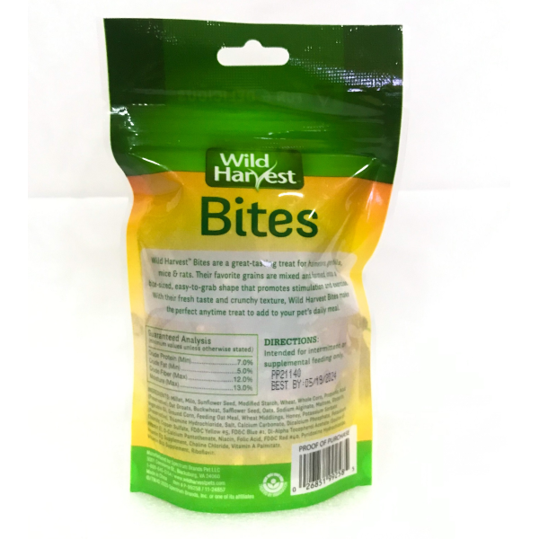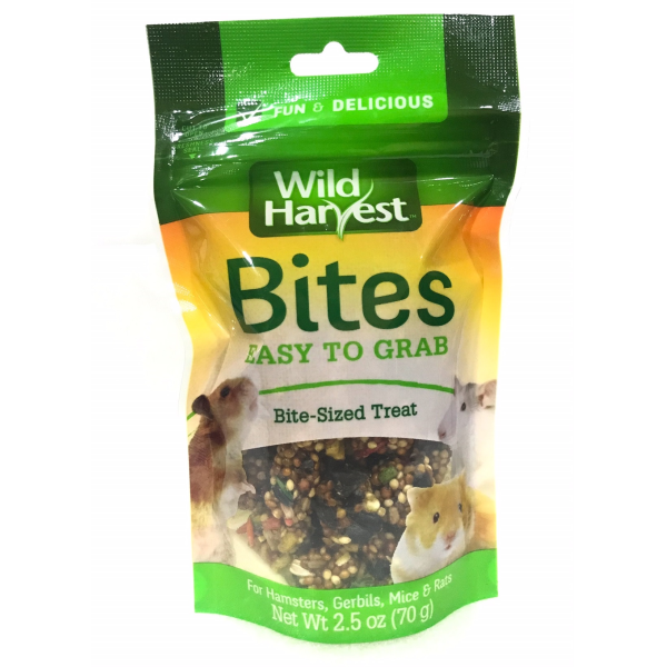 Wild Harvest Bites are great-tasting treat for hamsters, gerbils, mice & rats. Their favorite grains are mixed and formed into a bite-sized, easy-to-grab shape that promotes stimulation and exercise. Whit their fresh taste and crunchy texture, Wild Harvest Bites make the perfect anytime treat to add to your pets daily meal.