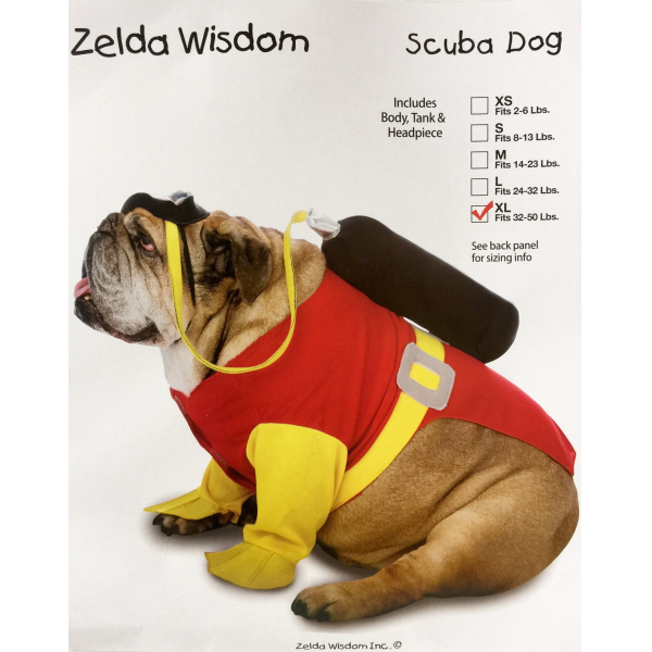 DISFRASES ZELDA SCUBA DOG COSTUMEX-LARGE4454-XL Sirve para mascotas de 32 a 40 libras,incluye disfraz y gorro. Medidas: Cuello 14"-18", 36 x 46 cm Pecho 21"-25", 53.5 x 63.5 cm Largo 18"-21", 46 x 53.5 cm