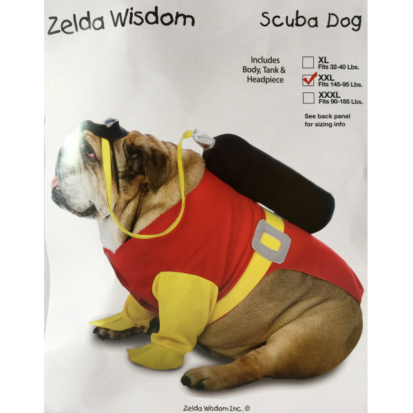 DISFRASES ZELDA SCUBA DOG COSTUME XX-LARGE4454-XXL Sirve para mascotas de 45 a 95 libras,incluye disfraz y gorro. Medidas: Cuello 18"-22", 46 x 56 cm Pecho 26"- 33", 66 x 84 cm Largo 22"-27", 56 x 68.5 cm