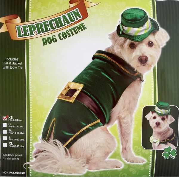 DISFRASES LEPRECHAUN DOG COSTUME X-SMALL 5000-XS Sirve para mascotas de 2 a 6 libras, incluye disfraz y gorro. Medidas: Cuello 6"- 9",15 x 23 cm Pecho 8"-11", 20.5 x 28 cm Largo 7"-10", 18 x 25.5 cm