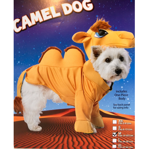 DISFRASES CAMEL DOG COSTUME MEDIUM 5012-M Sirve para mascotas de 14 a 23 libras Una sola pieza Medidas: Cuello 11"-14", 28 x 36 cm Pecho 16"-19", 41 x 48 cm Largo 13"- 15", 33 x 38 cm