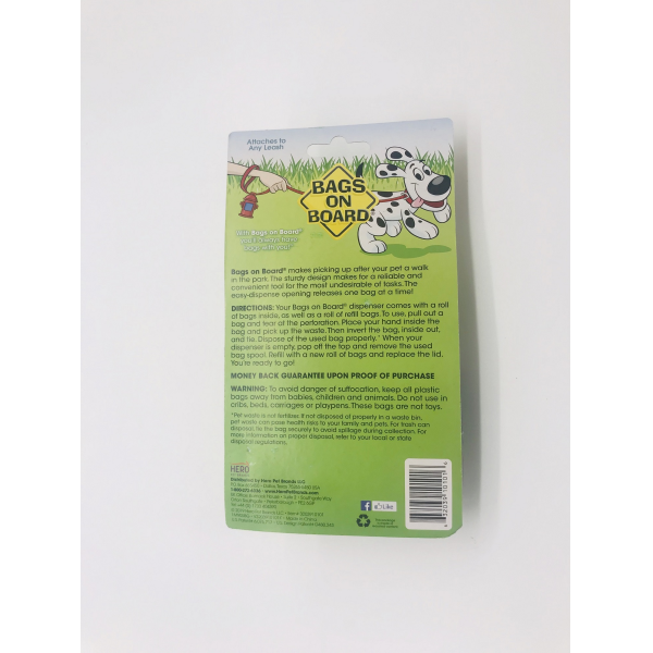 Bags on Board makes picking up after your pet a walk in the park. The sturdy design makes for a reliable and convenient tool for the most undesirable of tasks. The easy-dispense opening releases one bag at a time!