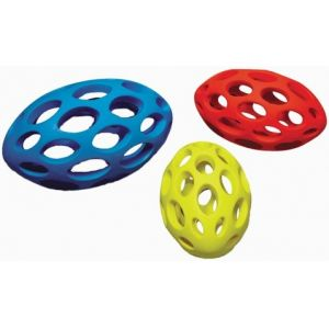 Juguete de goma en forma de un balón de futbol. Los hoyos en este juguete hacen que sea más fácil para su cachorro el poder morderlas y transportarlas. Variedad de tamaños y colores.