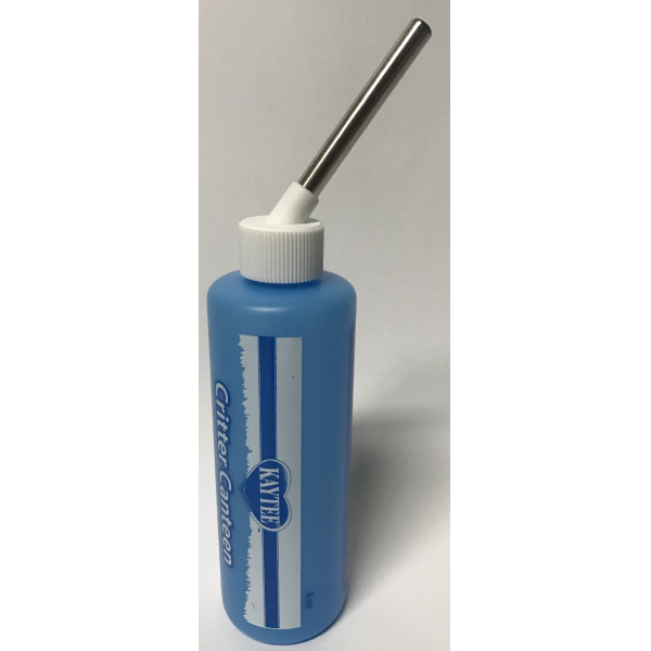 ESPAÑOL: Bebedero de Plastico Color Celeste Tiene un sistema anti goteo. Trae para colgar. 8 onzas ENGLISH: Critter Canteen Bottle hanger inside Drip Resistant BPA FREE 8oz