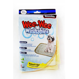 WEE WEE WASHABLES , LEAKPROOF MORE ABSORBENT THAN DISPOSABLE PADS RAISED EDGE TO PREVENT SIDE LEAKAGE NON-SLIP VINYL BOTTOM PROVIDES ADDED PROTECTION