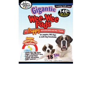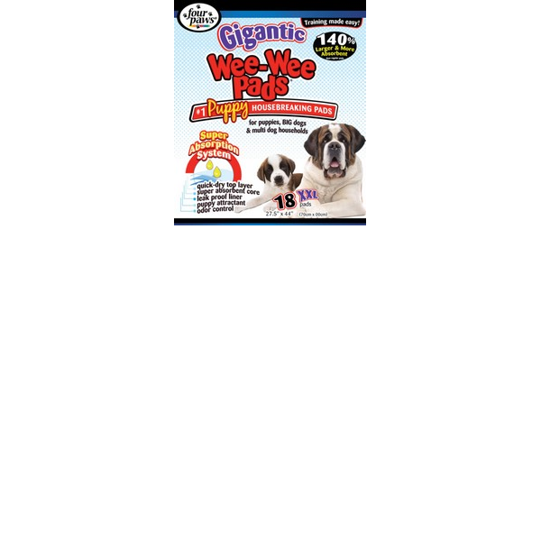 ESPAÑOL: Four Paws. Wee Wee Almohadillas Gigantes para perros grandes. Tienen una medida de 27.5 pulgadas de ancho por 44 pulgadas de largo. Eso es 140% más grande que nuestras almohadillas de tamaño regular. Son excelentes absorventes y neutralizan los olores. 18 Unidades por paquete.