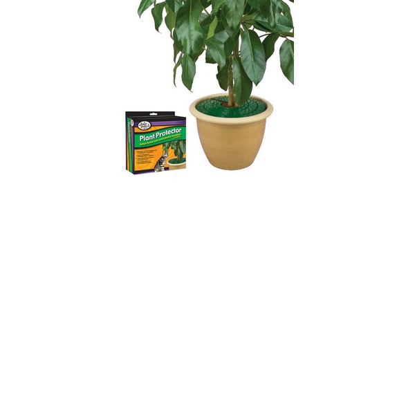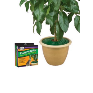 ENGLISH: The Plant Protector is a plastic disk that prevents cats from digging and climbing on household plants. The product is placed in the planter on top of the soil and cut to fit around the base of the plant; it can be adjusted to fit most standard size pots, ranging from 4 inches 16 inches. The Plant Protector can be covered up with a small amount of substrate to make it less obtrusive to the aesthetic value of the plant. Small nubs on the surface of the Plant Protector make it uncomfortable for a cat to stand or walk on. Slots allow water and plant food to penetrate easily into soil.