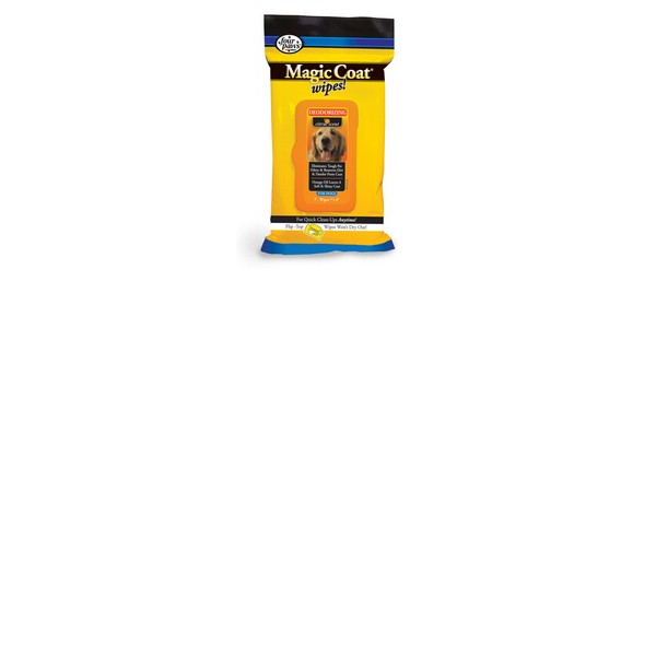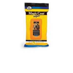 ENGLISH Magic Coat Deodorizing Wipes eliminates tough pet odors and removes dirt and dander from coat. The added orange oil will leave your dogs coat soft and shiny with a pleasant scent. Four Paws Magic Coat Wipes have been developed as a quick, efficient and convenient alternative to traditional bathing of pets. All of the Magic Coat Wipes remove odor and dirt from pets coats and can be used as a bathing alternative or just a quick clean up in between bathing or groomer visits