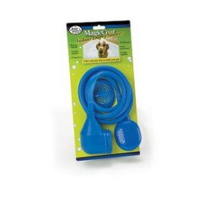 ENGLISH: The Magic Coat Indoor Doggy Shower easily connects to bathtub faucets. No tools required! Includes entle spray cleaning head with comb attachment and 5 foot hose.
