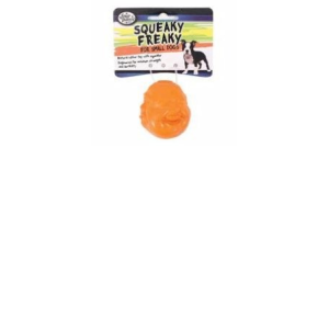 ENGLISH: Squeaky Freaky for Small dogs. Natural rubber toy with sqeoker. Engineered for maximum strength and durability. Rubber toys are excellent for cleaning and massaging your dogs gums. Rubber toys are a great interactive toy for your dog to enjoy. Caution: Always supervise your dig when playing with all toys. Remove the toy from pet immediately if any part become loose or detached.