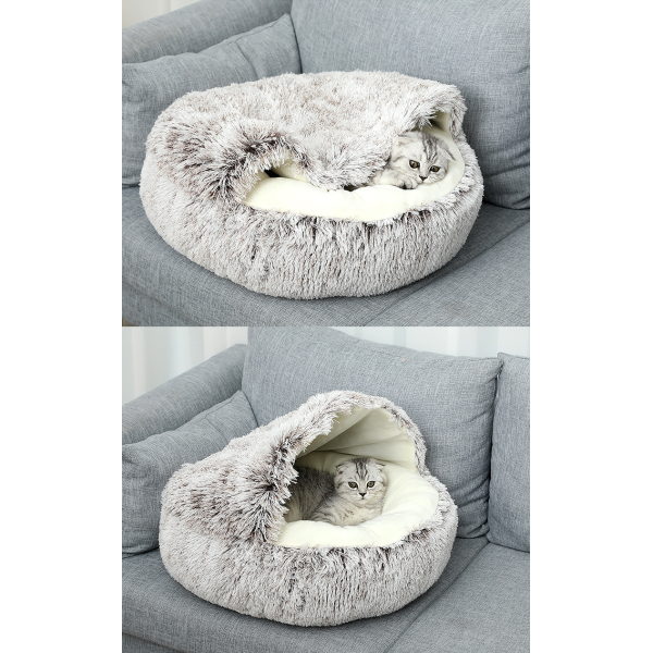 Cama redonda tipo cueva. Materiales: Felpa, algodón polipropileno, tela Oxford sin clips Medidas: Small: 40 cm diámetro. Medium: 50 cm diámetro. Large: 65 cm diámetro. Xlarge: 80 cm diámetro.
