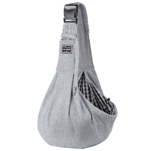 Bolso de tela gris, polyester. Medidas: 20 cm x 50.8 cm tira de 71-73 cm Para mascotas que pesen entre 6.5 y 8 kilos de peso.