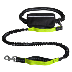 Correa elástica y cinturon manos libres. Material: nylon, reflectivo con cierre de acero. Medidas: Cinturon ajustable 85 cm a 130 cm. Correa 130-150 cm