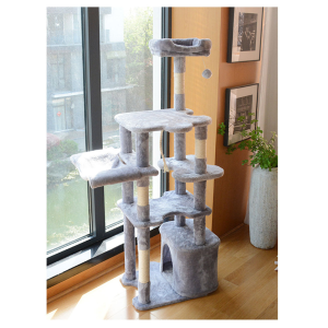 Poste rascador gris. Material: sisal, lana y tablero aglomerado. Medidas: 145 cm altura, 52 cm de largo y 48 cm de ancho.