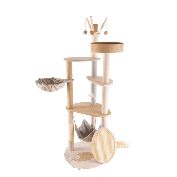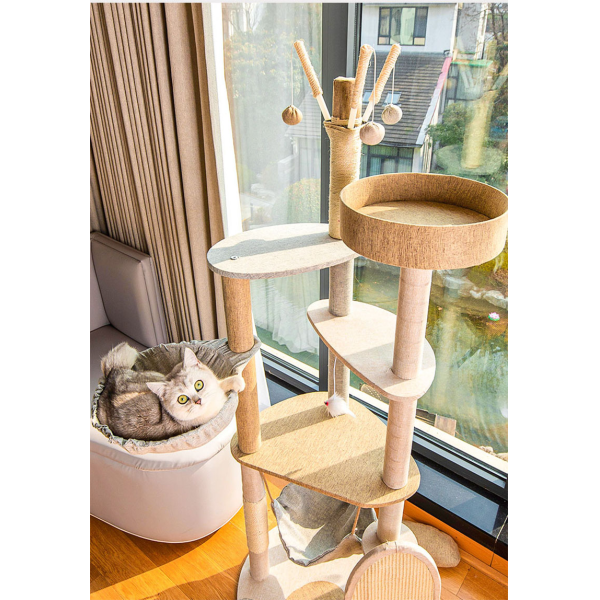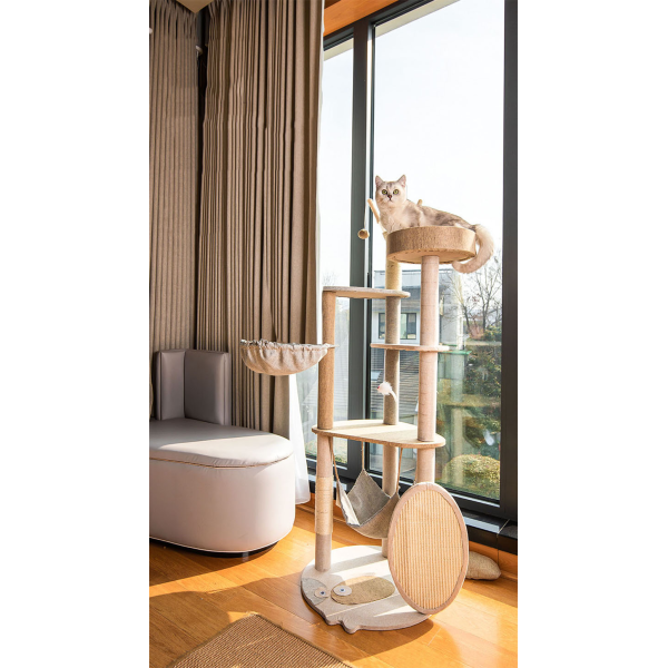 Poste rascador Material: sisal, lana y tablero aglomerado. Medidas: 145 cm de alto,53 cm de largo, 50 cm ancho.