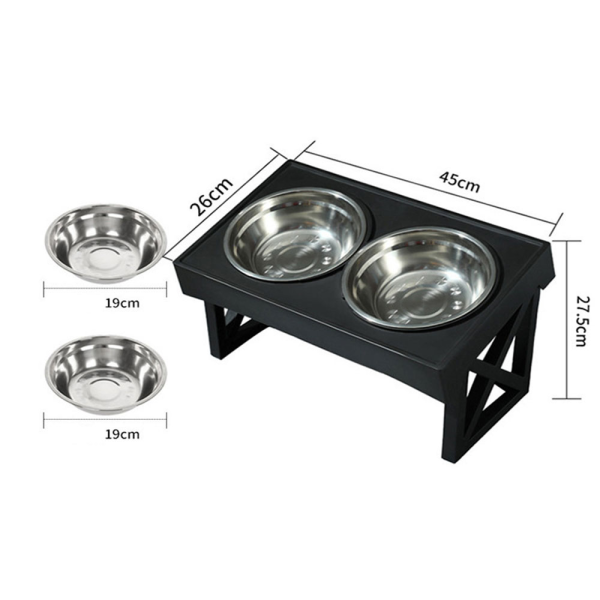COMEDERO ELEVADO DOBLE, DOS COMEDEROS, DOS COMEDEROS NORMALES PUEDE USARSE UNO PARA AGUA Y OTRO PARA COMIDA, TRES ALTURAS, ULTIMA ALTURA 15 GRADOS DE INCLINACION.