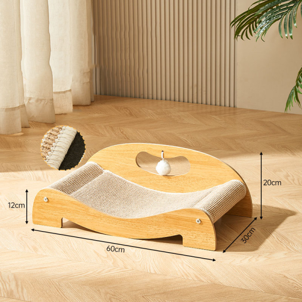 RASCADOR CAMA PARA GATO CON TRES BOLAS DE JUGUETE MEDIDAS: 60 X 30 X 20 CM MATERIAL: MADERA PRENSADA ECO-FRIENDLY Y SISAL.