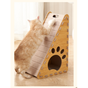 RASCADOR TRIANGULAR PARA GATO MEDIDAS: 40 X 30 X 60 X 70 CM MATERIAL: MADERA PRENSADA ECO-FRIENDLY Y TELA DE FELPA.