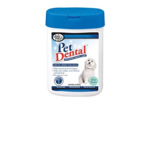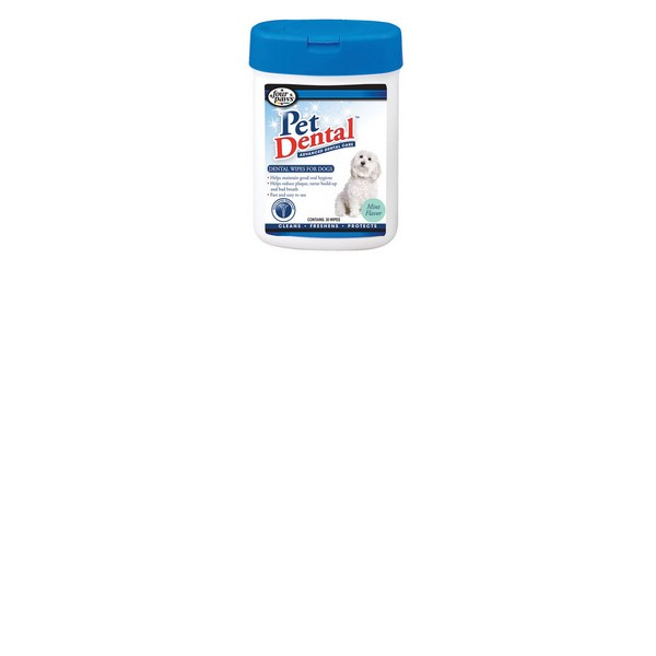 ENGLISH: Four Paws. Pet dental. Dental wipes for dogs. Helps maintain good oral hygiene. Helps reduce plaque, tartar build-up and bad breath. Fast and easy to use. Contains 30 wipes. Mint flavor.