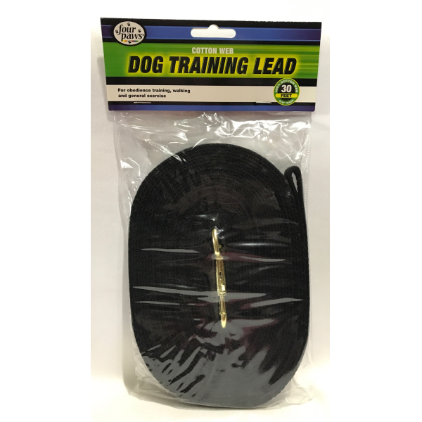 Manufactured of 100% natural cotton, Four Paws® Dog Training Leads are preferred and recommended by professional dog handlers and trainers. 5/8" wide and feature a solid bronze swivel snap for extra durability. Available in lengths from 6 feet to 50 feet in black.
