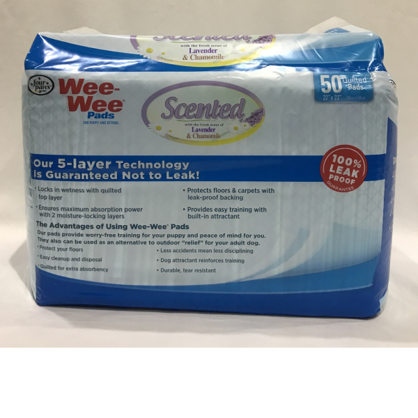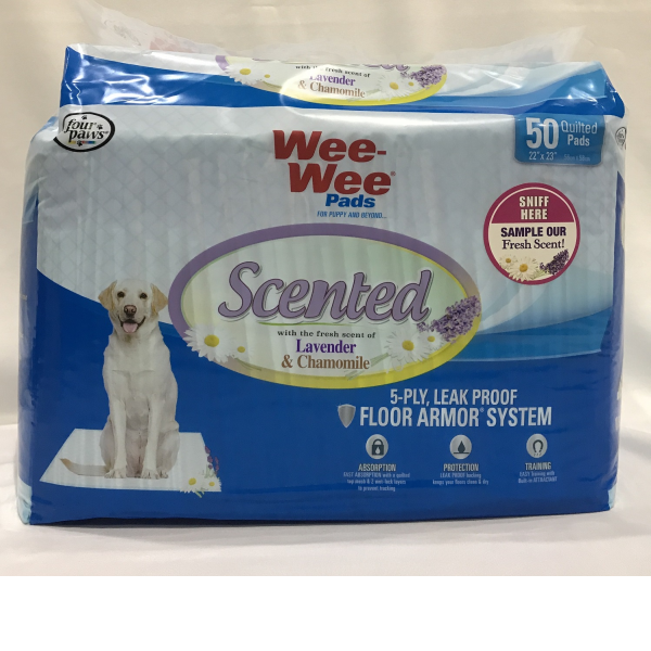 Wee-Wee® Scented Pads are high-quality, quilted, absorbent pads made with a 5-ply leak-proof Floor Armor® System. Treated to attract your pet when nature calls, Scented Wee-Wee® Pads provide a pleasing aroma of lavender and chamomile. Pads measure 22" x 23"