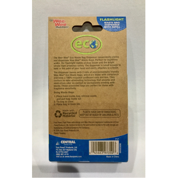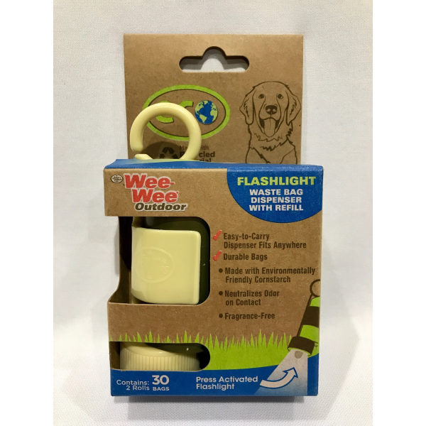 The dispenser comes with two rolls of environmentally friendly wee-wee eco waste bags, which are made with cornstarch and packaged using 100 % recycled cardboard boxes. This bags contain an odor-eliminating technology that absorbs and neutralizes odor on contact by permantly binding with waste. These unscented bags are perfect for thos with fragance sensitivity. This dispenser comes with an attached night time flashlight that makes the night walks a lot easier.