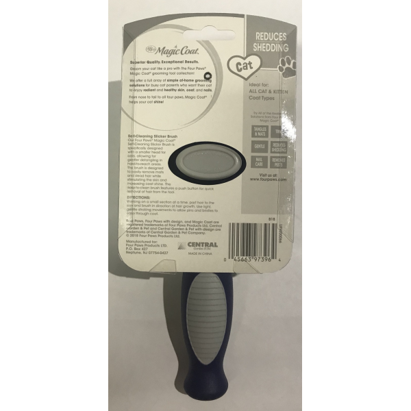Self-cleaning slicker brush is specifically designed with a smaller head for cats, allowing for gentler detangling in hard-to-reach areas. the brush is designed to easily remove mats and dead hair while stimulating the skin increasing coat shine. The easy-to-clean brush features a push button for quick removal of hair from the tool.