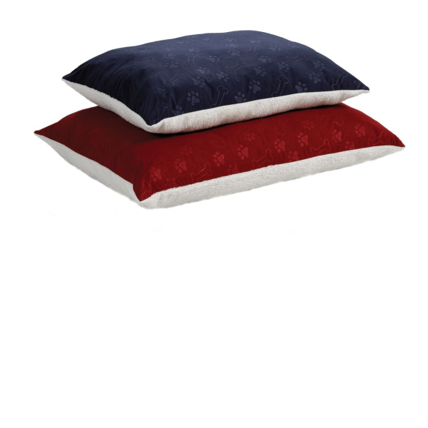 Extra stuffed, polyfill pillow pet bed featuring synthetic sheepskin and an embossed paw print design.
