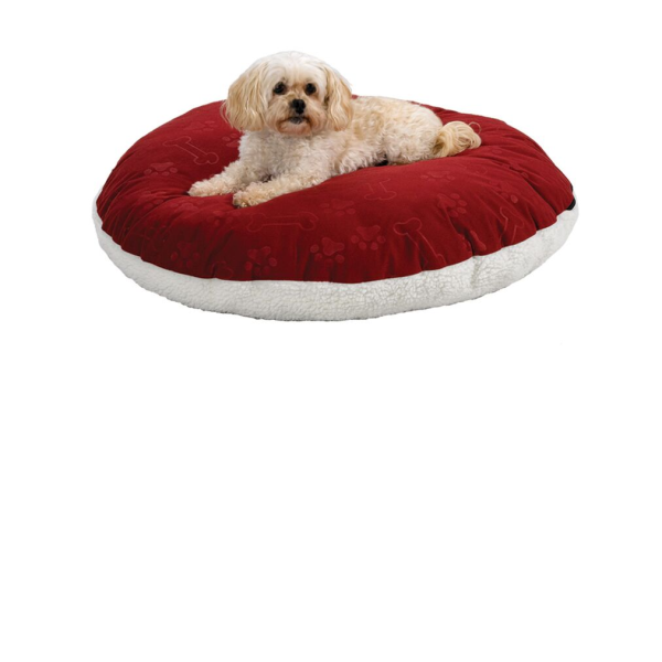 Extra stuffed, polyfill pillow pet bed featuring synthetic sheepskin and an embossed paw print design.