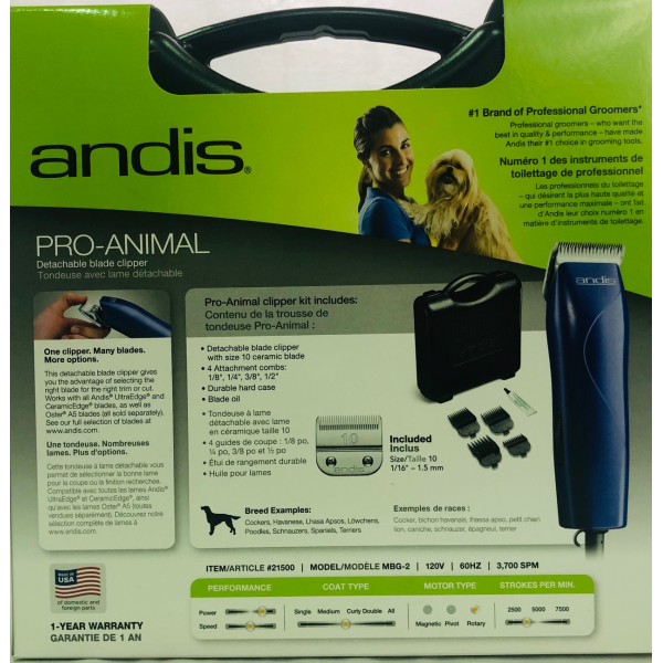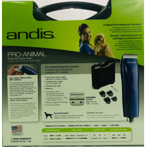 ESPAÑOL: Maquina Profesional Rasuradora Semi Pro Andis, ideal maquinilla de gran alcance para completar al perro, poderosa de 3700 velocidad de hoja de spm , diseñada para que se adapte a la mano, silenciosa, motor rotatorio poderoso, libre mantenimiento. INCLUYE: Maquina, cuchilla tamaño 10 CeramicEdge hoja,cuatro guias, aceite para la maquina. Modelo A-5.