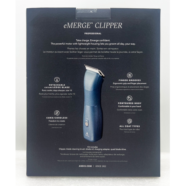 Kit includes: Clipper, blade cleaning brush, blade oil, charging adapter, quad blade drive