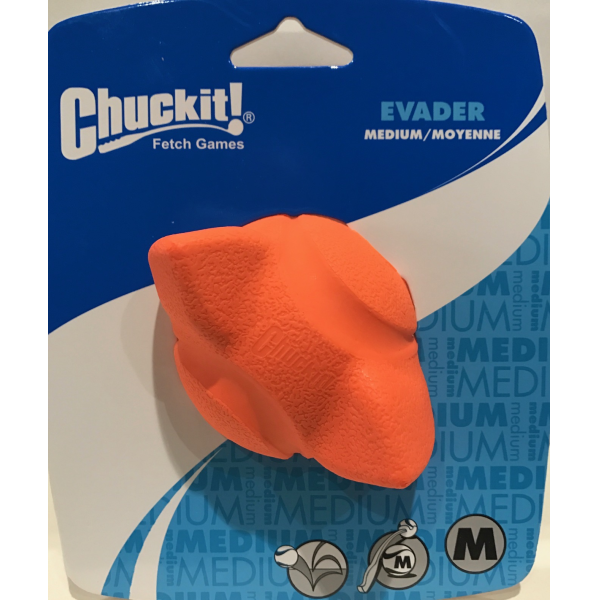 Chuckit Evader es constituido en un 100% de hule, y está hecho para largas horas de juego de su perro. Ideal para ser atrapado en espacios amplios así como juegos en espacios pequeños. Su acción aleatoria mantendrá al perro adivinando en dónde va a aterrizar. Hecho de un caucho naranja brillante y es hueco y ligero. Vuelo corto. Fácil de limpiar. ¡ADVERTENCIA! Jugar bajo supervisión. Reconozca a su perro y elija el tamaño adecuado y el tipo de juguete ideal para evitar asfixia u otros daños. Inspeccione este juguete regularmente; Si el juguete está dañado o si las partes se separan, retire el juguete y las piezas, ya que pueden resultar dañinos. No es un juguete infantil.