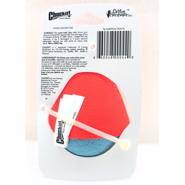 Launch it and watch it float! The Chuckit! Amphibious Shark Fin is one tough toy that your dog is going to love chasing. The unique self-righting technology keeps the Amphibious Shark Fin always in the fin-up position and makes it easy to spot on land or in the water. Designed for exceptional visibility and performance for hours of fun. Made of a soft but rugged textured material thats easy on a dogs mouth. Easy to clean after a day of fun filled play. The perfect complement to your Chuckit! Launcher. This high floating toy is perfect for water play. Extremely visible with bright colors. Ideal for the beach, lake, or pool. For supervised play only. Know your dog and choose the appropriate size and type of toy to prevent choking or other harm. Inspect this toy regularly; if the toy is damaged or if parts become separated, remove toy and parts as injury may result. Not a childs toy. Ships in assorted colors.