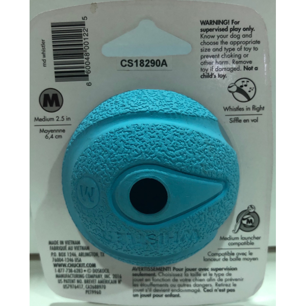 Ready, set, fetch! The Chuckit!® Whistler® keeps the game of fetch interesting and challenging for your dog. Four holes in this high-bouncing rubber ball produce a whistle as it soars through the air to keep your dog interested and focused. Gripable rubber ball is made just the right size to use with your Chuckit! Launcher. These high-bouncing balls are available in sizes small, medium and large, with one and two-pack options.