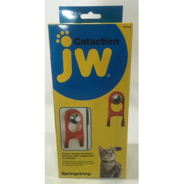 This unique design allows the Spring String to attach to any style of doorknob, transforming your door into a fun, interactive toy in seconds! A furry, feathered mouse dangles irrestibly on a bungee cord from the doorknob attachment at the perfect height to entice curious cats for hours of play!