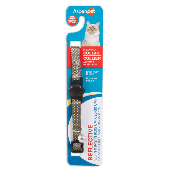 Keep your cat safe and fashionable with a Petmate® Adjustable Reflective cat collar. Color-coordinated "Meow" buckles and jingle bells give these collars a unique flair and personality matched only by the cats wearing them! These collars are made from quality webbing with a light-reflecting contrast dot print, come in fun, trendy patterns and feature a multi-directional breakaway buckle that easily releases, should your cat become entangled. Safe for indoor and outdoor use.