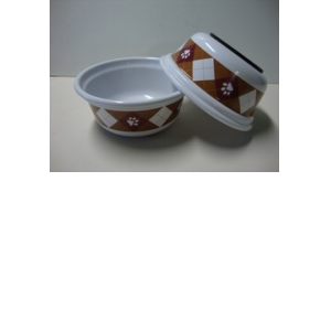 Comedero de Melanima cuadrado con un diseño de huesitos y rombos en su exterior.