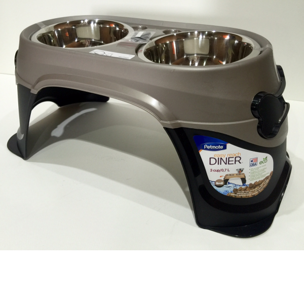Meet dogs at their level with the Petmate Easy Reach Diner elevated feeding and watering unit. Any dog will benefit from the improved digestion that comes from eating in a confortable position, and older dogs will apreciate how easy it is on their joints. This elevated feeder and waterer prevents the stooping and disconfort associated with bending down to eat or drink. Easy-to-grip bone shapes handles for the pet parent and removable stainless steel bowls make this product easy to lift and clean. Eco, 95% pre-consumer recycled plastic content. Elevated, spill-free rims help to keep water and food where they belong and rubber inserts reduce noise and keep bowls in place. Made in USA.