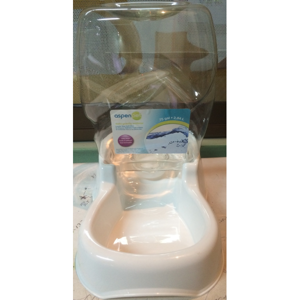 Aspen Pet Gravity Waterer is the ideal waterer for your pets needs! As a busy pet parent you can now spend more time playing with your furry friend and less time replenishing his water supply. This high-quality waterer allows your pet to have continuous access to fresh water throughout the day. Café style, clear bottle design allows pet parents to easily monitor the water level at a glance. Pet parents choose the perfect sized waterer to fit your pets needs. Made in the USA. .75 gal or 2.84 liters. Size 6.5 inches wide x 9.57 inches long x 9.8 inches high. Color white.