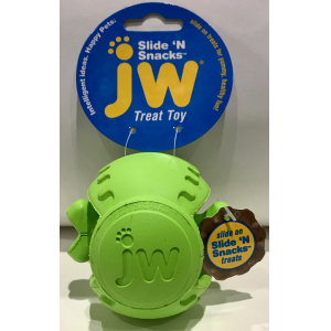 Made of durable rubber, the JW Slide N Snacks Ball easily slides on treats. These treats are designed to come off easier, helping to prevent your dog from destroying the toy. WARNING For supervised play only. Know your dog and choose the appropriate size and type of toy to prevent choking or other harm. Inspect this toy regularly; if toy is damaged or if parts become separated, remove toy and parts as injury may result. Not a childs toy.