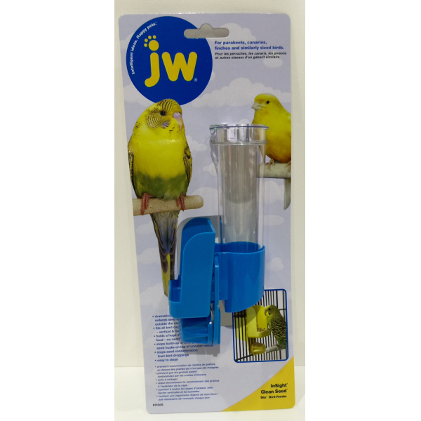 JW Clean Seed Silo Bird Feeder dramatically reduces seed spill outside the cage for your pet bird. This easy-to-clean bird feeder can be filled from outside of cage. No more buildup of empty seed husks on top of uneaten seeds. Stops seed contamination from bird droppings. JW Clean Silo Bird Feeder fits all bird cages, including vertical and horizontal bars.