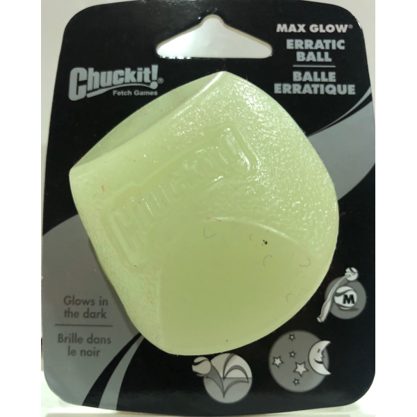 The Chuckit!® Max Glow® Erratic Ball is a durable geometrically shaped rubber ball that bounces erratically to keep the game of fetch interesting and challenging for your dog. The added Max Glow technology quickly absorbs light from any source and glows for up to 30 minutes of playtime after dark. The squared corners cause the ball to bounce every which way when thrown. Made from durable rubber and easy-to-clean. This high-bouncing, glow-in-the-dark erratic ball is available in size medium, sized just right for use with your medium Chuckit! Launcher.
