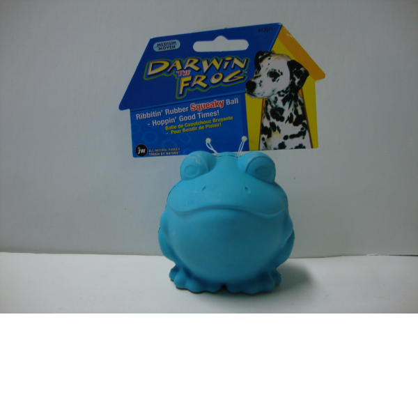ENGLISH: Darwin the frog. Rubbitin rubber squeaky ball. Small. Hoppin good times. As with any pet toy, always supervise your pet while playing. Remove toy it damaged or if parts become separated, as injury could result.