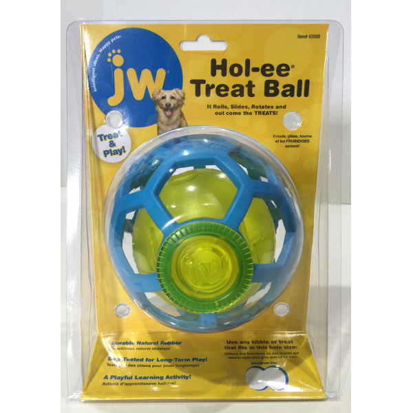 The JW® Hol-ee® Treat Ball is an ingenious, dog treat dispenser and dog toy all rolled up into one. As your dog interacts with the toy the treat tube and inner ball move from side to side dispensing treats. Easy and simple to use and fun and entertaining for long-term play. Helps curbs destructive behaviors by keeping your dog engaged. Features patented honeycomb shape thats easy for dogs to carry. The innovative ball is extremely durable and double-molded to stand up to tough chewers. Tough enough to stand up to constant chewing and can be stretched and tugged. Easy to use. Simply unscrew the cap, place treats or kibble inside of treat tube, and screw cap closed. Made from certified non-toxic durable rubber. Ships in assorted colors.