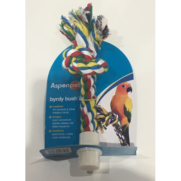The JW Byrdy Bush is a must-have for your pet bird. Keep your bird stimulated with the Byrdy Bush to prevent boredom. The Byrdy Bushs tasseled end encourages healthy preening behaviors and helps to curb feather plucking. The multi-colored rope perch easily attaches to any cage configuration.