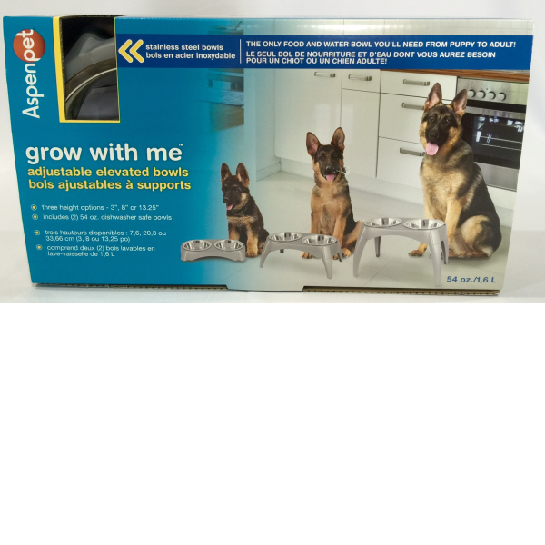 Aspen Pet Grow with me feeder is the ideal feeder for your growing pets needs. As your sweet pet grows from his puppy to senior years, this adjustable feeder grows along with him. It includes two stainless steel bowls 54 oz each with easy-to-insert variable height legs. This high-quality elevated feeding and drinking system promotes easy digestion for your furry friends sensitive stomach and less stress to his back or joints.