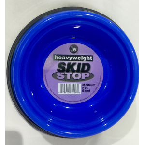 Stop your beloved dog from scooting, sliding, and chasing his bowl across the floor with the JW Pet Skid Stop Bowl. This Skid Stop bowl is made of easy-to-clean, stain-resistant plastic with a heavy-duty rubber rim. This rim makes it nearly impossible for your furry friend to skid or tip its bowl during meal time. Assorted colors.