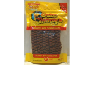ENGLISH: Cube chomps. 17 counts. Peanut better flavor. NEW! 17 Count package of 6" large cubes made with a break away design for all size dogs. These tasty cubes promote safer chewing habits and they have an irresistible flavor that all dogs love. Available in Peanut Butter & Chicken Flavors.
