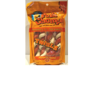 ENGLISH: Pork chomps. 4 count. Pepperoni twists flavor. These tasty twists are the safer alternative to rawhide that won´t stain carpet.